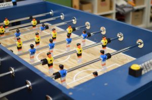 Das KT Bau und Umwelt arbeitet in Kooperation mit dem KT Modellierung und Simulation an einem Tischkicker als KT-übergreifendes Projekt. Vom 3D-gerechten Konstruieren einiger Modelle in CAD bis zum fertigen Produkt. Darüberhinaus fertigt das KT Additive Fertigung einige Bauteile wie zum Beispiel einen Torzähler oder Balleinlässe mittels 3D Druck an.